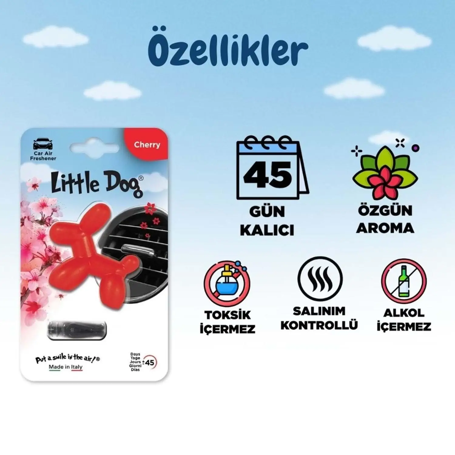 Little Dog Kiraz, kirazın ferahlatıcı ve tatlı aromasıyla bulunduğunuz her ortama canlılık ve enerji getirir. Baharın en güzel anlarını hatırlatan meyvemsi ve taze kokusuyla, 45 güne kadar kalıcı etkisiyle ortamınıza ferahlık katar. İtalya’nın üstün kalite anlayışıyla üretilmiş bu özel ürün, tatlı ve meyveli kokuları sevenler için mükemmel bir tercihtir.