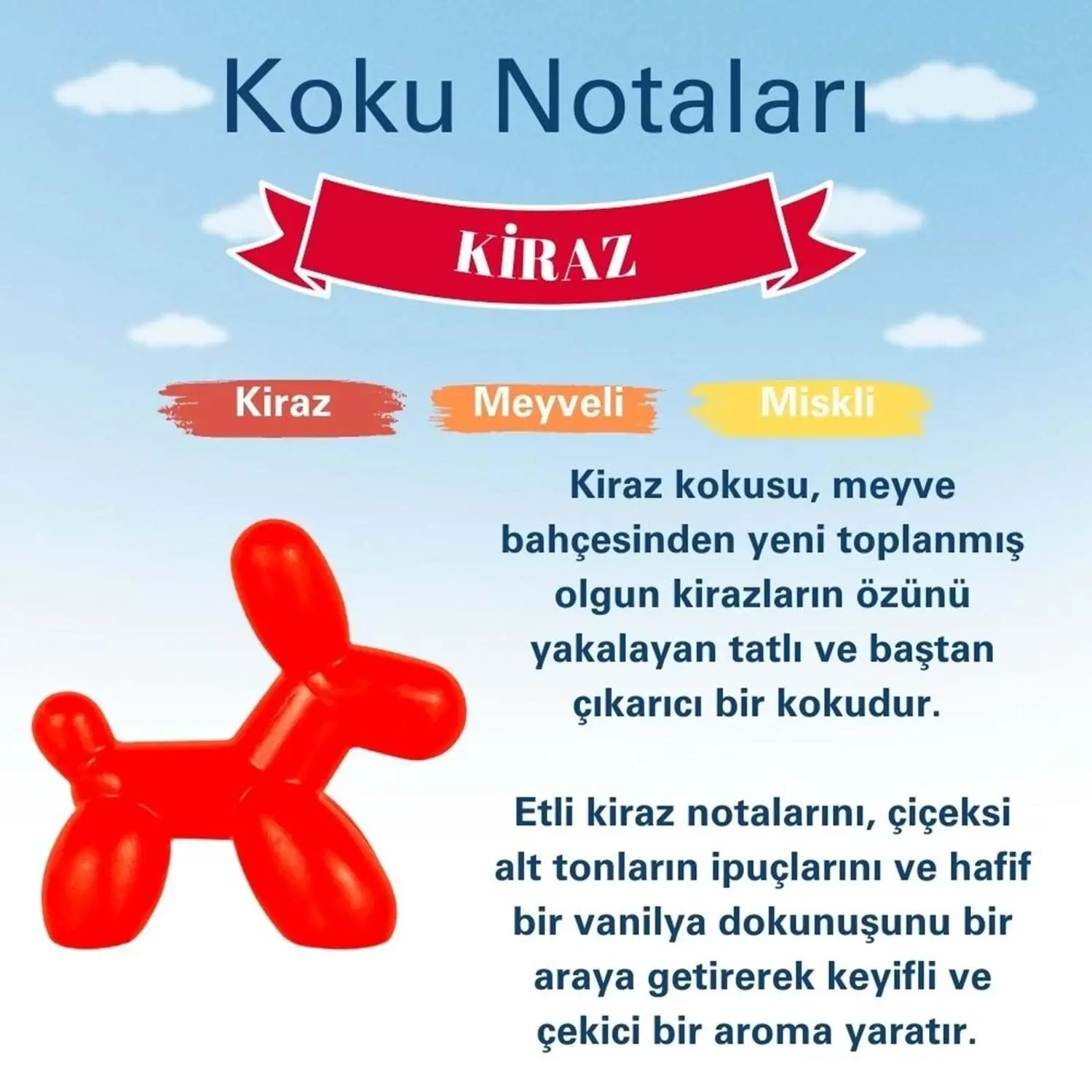 Kiraz kokusu, kirazın hafif tatlı ve neşeli notalarıyla bulunduğu ortamı keyifli bir hale getirir. Günlük yaşamda enerjik ve canlı bir atmosfer yaratmak isteyenler için ideal olan bu koku, her nefeste huzur ve tazelik sunar.