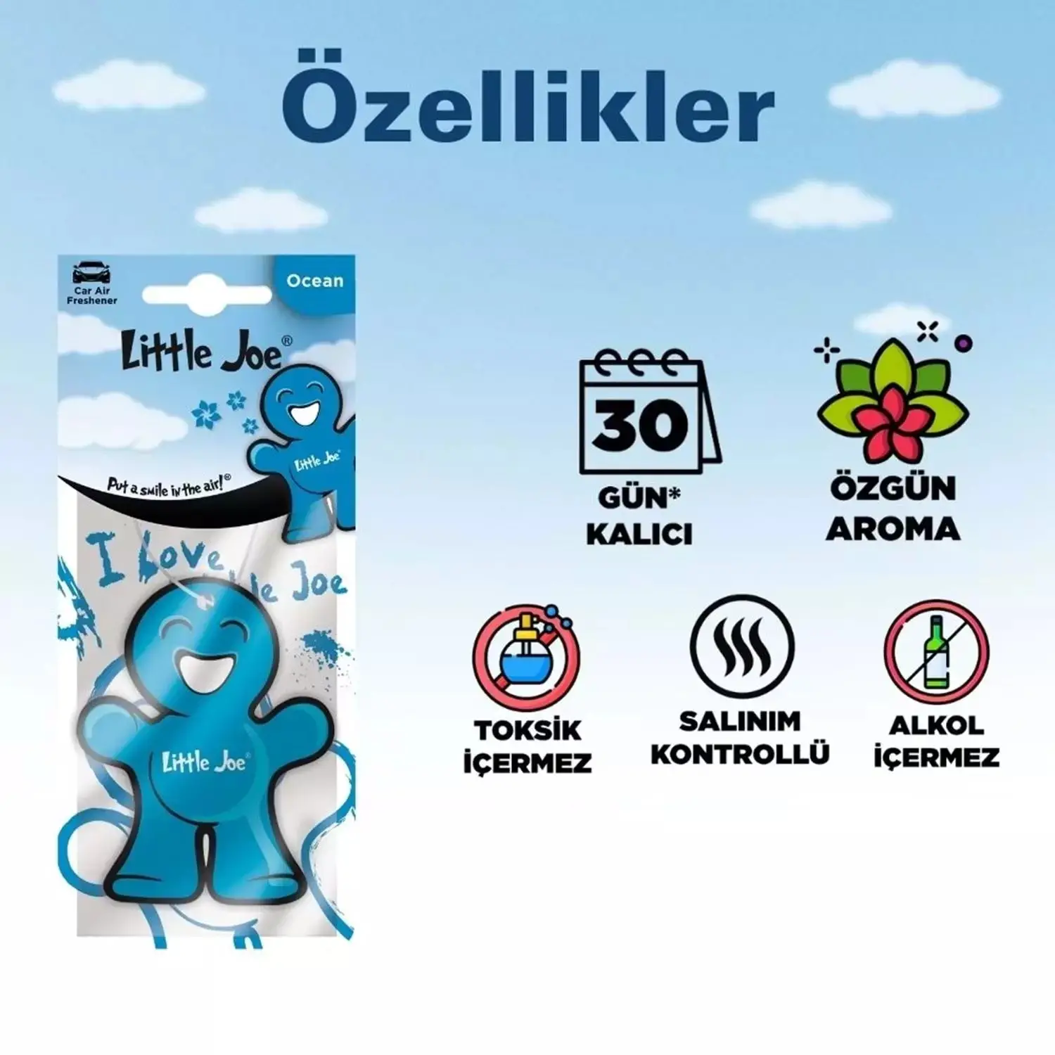 Little Joe Paper Okyanus, 30 güne kadar kalıcı koku performansı ve özgün aromasıyla yaşam alanlarınızı yeniler. Alkol ve toksik madde içermeyen sağlıklı formülü ile güvenli bir kullanım sunar. Asma kart tasarımıyla pratik bir kullanım sağlar ve her ortamda ferahlatıcı bir deneyim yaratır.