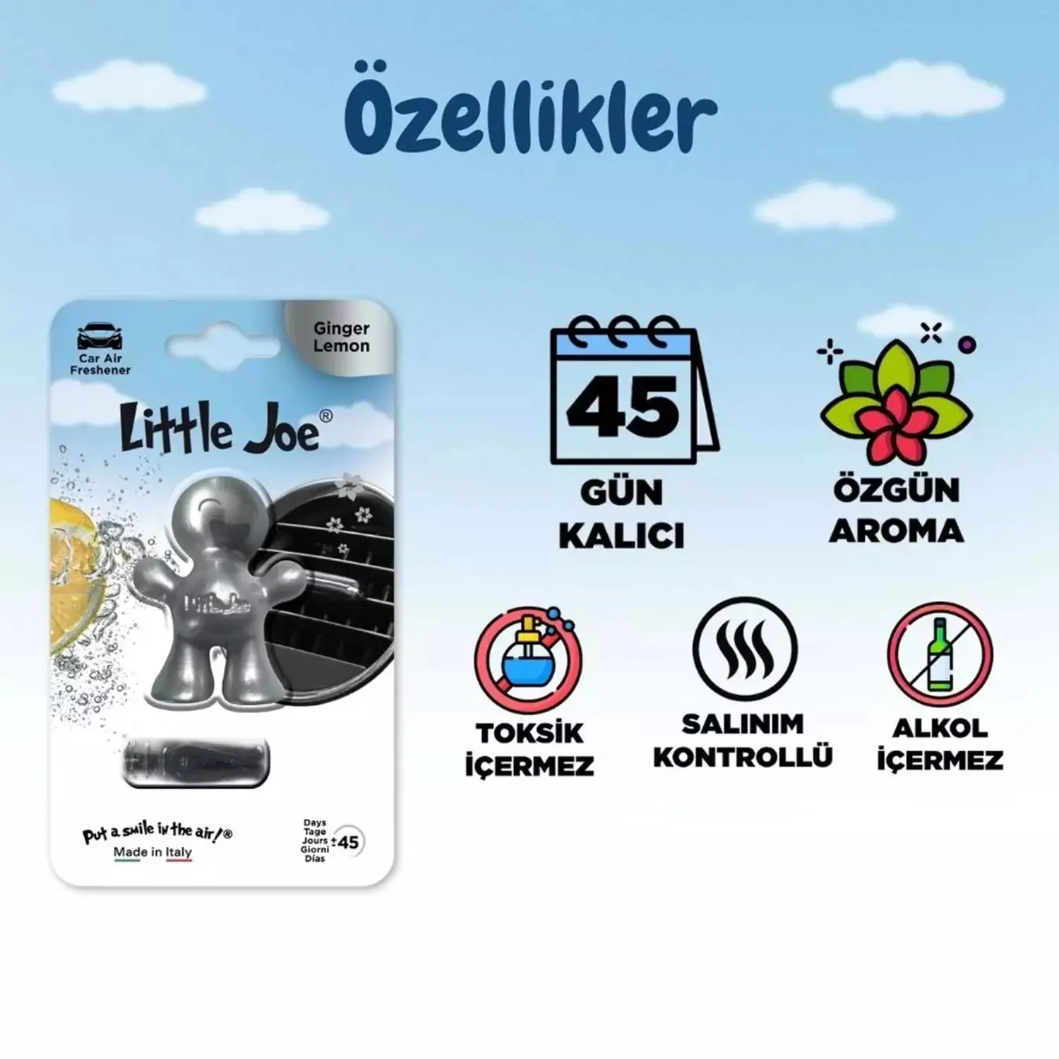 Little Joe Zencefil Limon, zencefilin baharatlı tazeliği ile limonun ferahlatıcı aromalarını bir araya getirerek bulunduğunuz her ortamı canlandırır. Doğal ve enerjik bir atmosfer yaratan bu eşsiz koku, 45 güne kadar etkili kalıcılığıyla ruhunuzu tazeler. İtalya'nın yüksek kalite standartlarına uygun olarak üretilmiş olan bu özel ürün, zencefil ve limonun ferah uyumunu sevenler için mükemmel bir tercihtir.