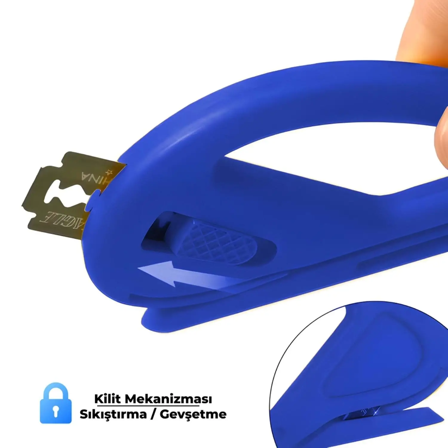 • Maksimum Güvenlik: Gizli bıçak yuvası sayesinde hem kullanıcıyı yaralanmalardan korur hem de araç yüzeyinde kaza ile oluşabilecek çiziklerin önüne geçer.