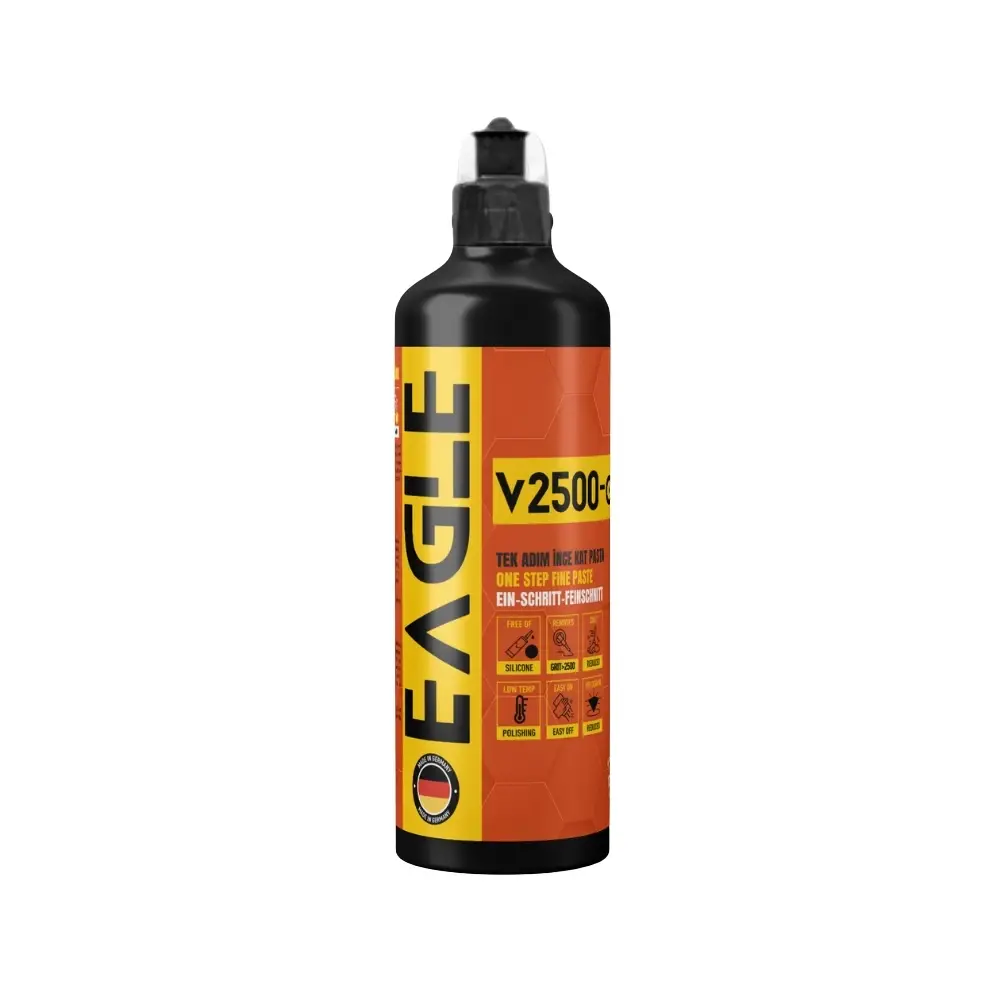 V2500 Tek Adım Pasta, güçlü bir aşındırıcı taşlama bileşeni karışımı içeren silikon içermeyen profesyonel, yoğun bir sürtünme bileşiğidir. Termal olarak optimize edilmiş alüminyum oksit mikro parçacıkları, çok basit makine kılavuzluğuyla güvenilir kusur düzeltmesi sağlar. Cilalamaya başladıktan sonra, kesim anında gerçekleşir ve daha az hologram ve homojen, düzgün bir parlaklık bırakır. ürünü parlatma pedine veya keçesine eşit şekilde uygulayın ve Boyalı yüzeye çapraz çizgiler çizerek bölümler halinde uygulayın. Cila kalıntılarını yumuşak bir mikrofiber bezle silin.